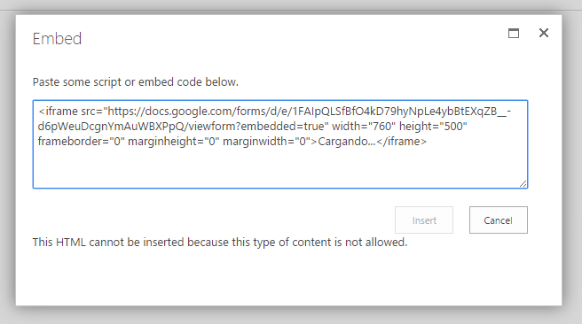 En este caso, hemos recibido un error que dice This HTML cannot be inserted because this type of content is not allowed. Esto ocurre porque la página de formularios de Google no está añadida a los dominios de confianza de HTML externo. Para añadir este dominio, desde la configuración del sitio, entramos en HTML Field Security.